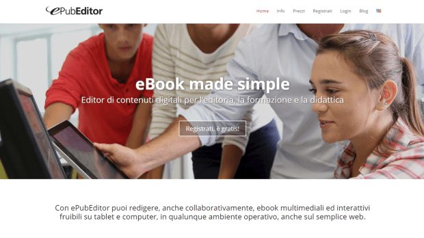 ePubEditor è un ambiente online che permette di creare ebook multimediali e interattivi, fruibili dal computer o direttamente dai propri dispositivi mobili. L’applicazione permette di inserire, in modo semplice e intuitivo, testo, formule matematiche, link, tabelle, immagini, contenuti audio e video, domande a scelta multipla, domande vero/falso e altre attività interattive. È inoltre possibile scegliere di condividere la redazione di un ebook (di cui si è proprietari) con altri utenti iscritti a ePubEditor. Gli ebook prodotti possono essere distribuiti tramite link pubblico, visualizzati dagli altri utenti di ePubEditor (se aggiunti alla vetrina pubblica dei lavori) o esportati in formato EPUB, SCORM e PDF.